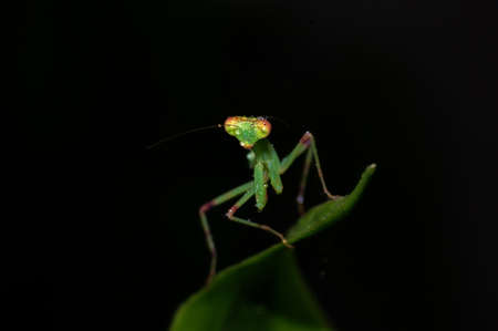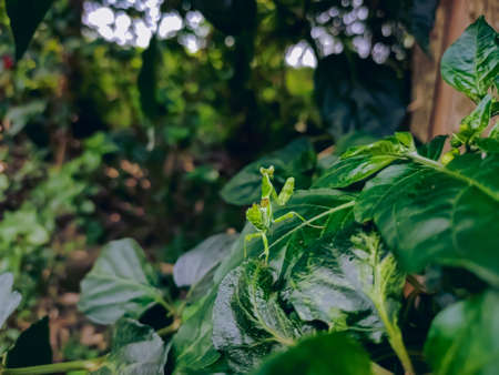 Close up shoot of a tiny mantis standing on a kale in home garden