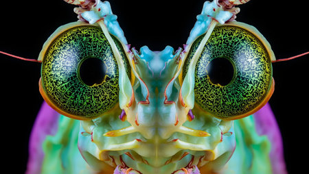Detailed close up of a mantis shrimp vividly colored compound eyes and segmented antennae