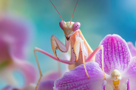 A striking pink praying mantis is captured in a detailed macro shot, its eyes and antennae sharply in focus against a soft teal background.