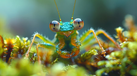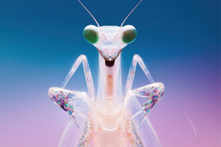 Stunning translucent praying mantis with vivid green eyes against a vibrant gradient background, representing nature s beauty and uniqueness