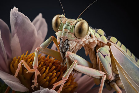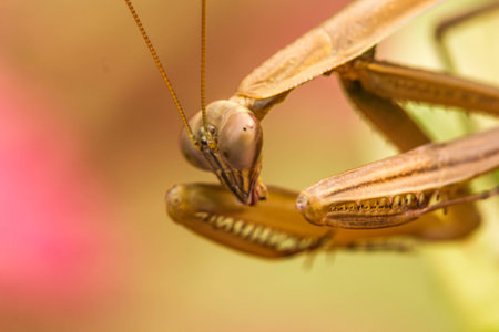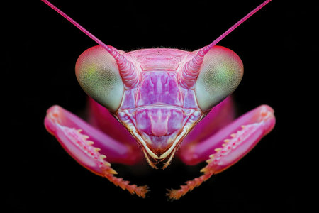 Stunning close up of a vibrant pink praying mantis showcasing intricate details and textures in its features and exoskeleton, perfect for nature enthusiasts and educators