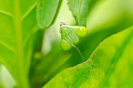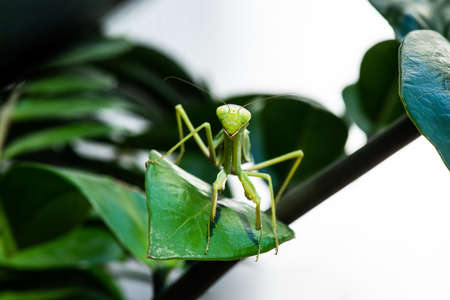 Close up of praying mantis on a green leaf. (Mantis religiosa)