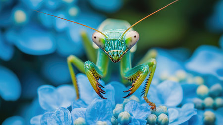 Bright green praying mantis perches atop vibrant blue hydrangea flowers, its captivating gaze drawing the viewer in