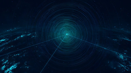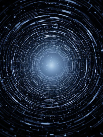 A dark blue abstract tunnel of light with glowing concentric rings and scattered particles, creating a sense of speed and infinite depth.