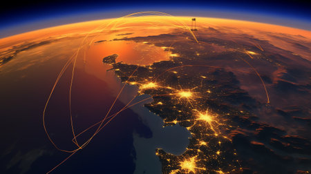 A glowing network of colorful lines connects illuminated cities across the Earth at night, with a sunrise on the...