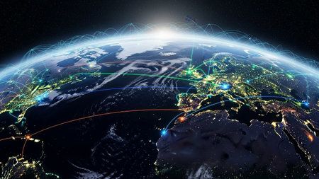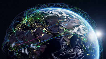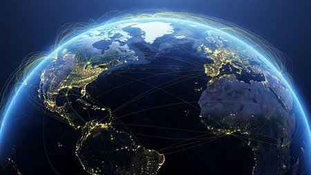 The Earth at night is depicted with illuminated continents and a network of glowing lines connecting cities globally.