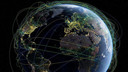 The Earth at night glows with city lights and is overlaid with a vibrant network of colorful lines connecting...