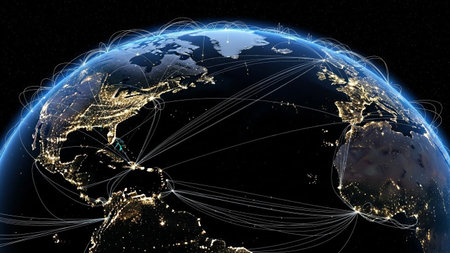 A glowing Earth at night, crisscrossed by luminous lines representing global connections and data flow across...
