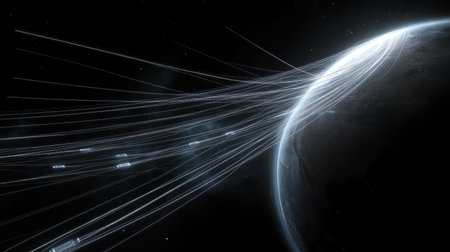 A night view from space, featuring illuminated trails of light over a dark, city-lit planet