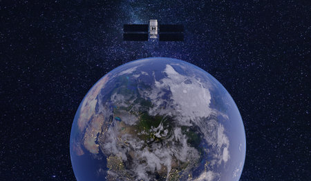 A satellite orbits Earth, with clouds in the backdrop, highlighting technological advancement.