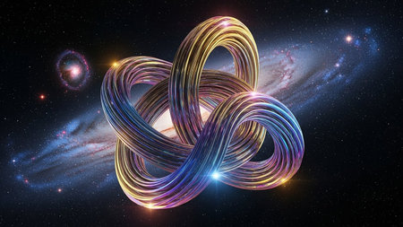 An intertwined metallic torus knot sculpture with iridescent rainbow colors is set against a backdrop of a starry galaxy and nebula.