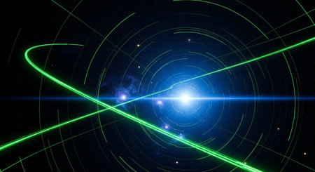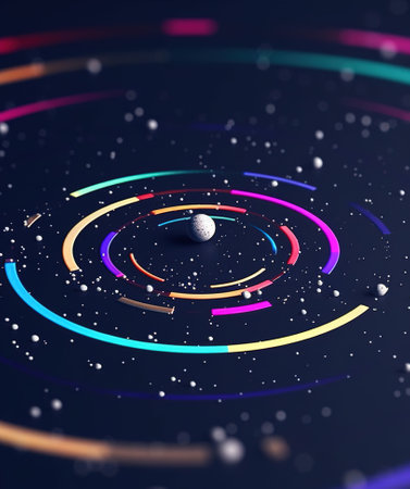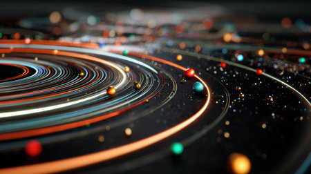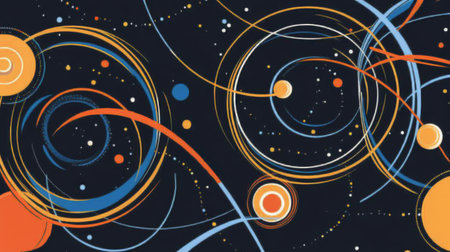 Vibrant orbs and swirling lines create a dynamic cosmic pattern, showcasing energy and movement in a dark, captivating background.