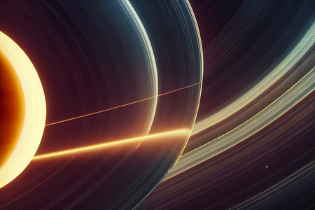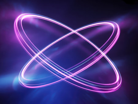 An abstract illustration features a glowing sphere at its center, encircled by vibrant, flowing rings of light that create a dynamic and mesmerizing visual, suggesting themes of science, technology, and energy.