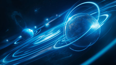 Two glowing planets with blue rings orbit in a dark, starry space, connected by luminous trails.