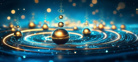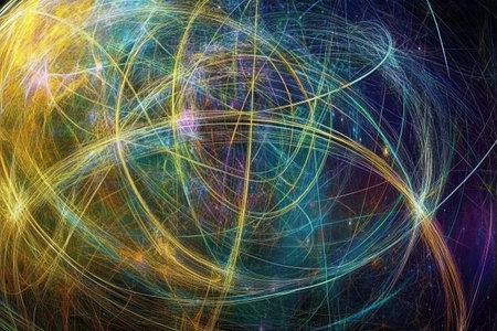 This illustration highlights intricate quantum patterns and energy flows radiating in a vivid spectrum of colors.