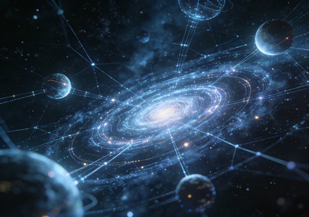 Medium shot. structured cosmic background with various elements such as planets, stars, and galaxies