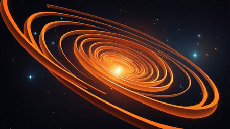 Vibrant orange spirals radiate from a central light source in deep space. The dynamic motion creates an alluring pattern amidst distant stars.