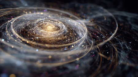 This image captures a mesmerizing cosmic spiral galaxy filled with twinkling stars and glowing dust, creating an abstract representation of the universe's beauty.