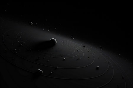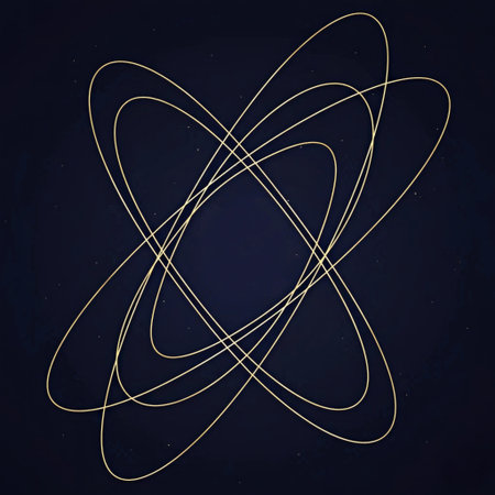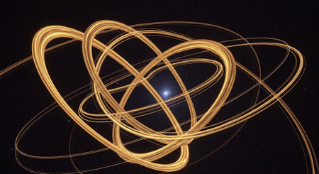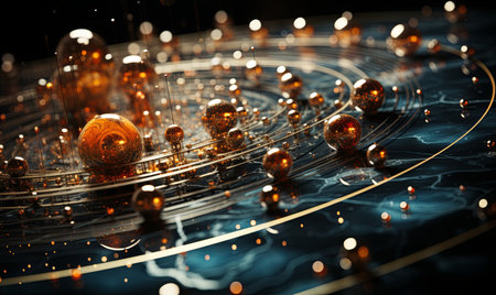 An abstract image with gold and black lines forming a structure reminiscent of the solar system on a black background.