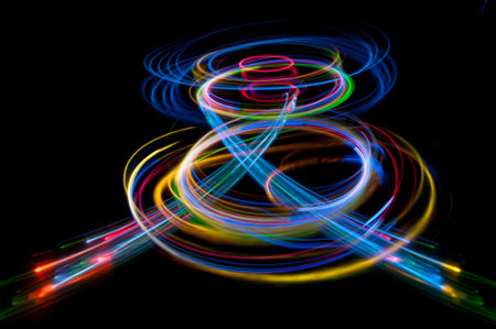 A captivating image of colorful light trails creating intricate patterns against a dark background. The lights exhibit a mix of purple, orange, and yellow hues, forming a mesmerizing display of motion and energy.