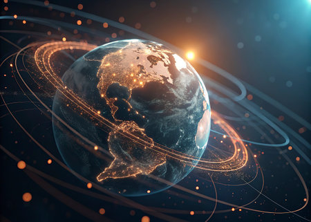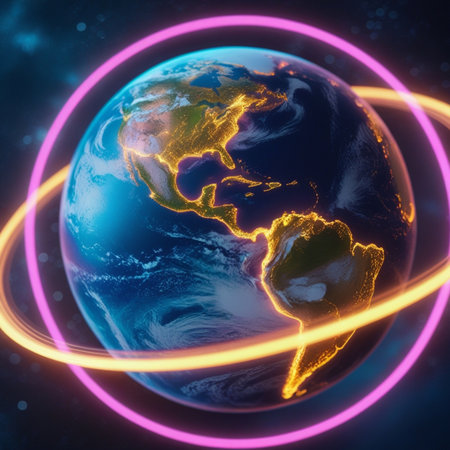 Experience a breathtaking view of Earth from space, featuring vibrant rotating light trails that symbolize connection and technology.