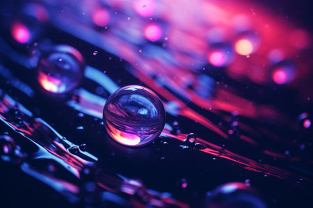 Delicate iridescent bubbles resting on a smooth reflective surface create a dreamy aesthetic. This image evokes a sense of tranquility and modern elegance, perfect for artistic and creative projects.