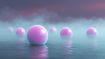 This captivating image features floating spheres in a misty water setting at dusk, showcasing a serene interplay of soft pink and blue hues for a dreamlike atmosphere.