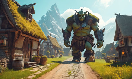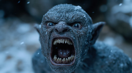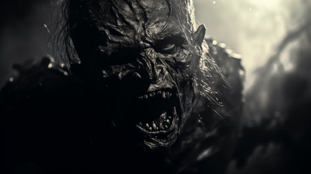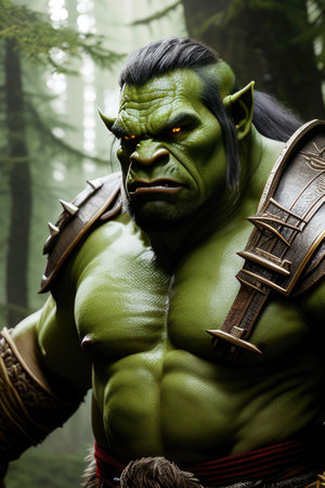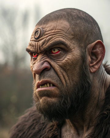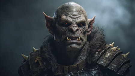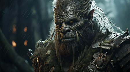 the ogre hybrid, a fantastical creature with imposing features, gazes intensely into the distance, its rugged skin and sharp teeth a testament to its fearsome reputation, set against a dark, mystical background that evokes a sense of ancient mythology and fantasy world-building. ai generated