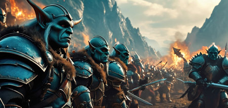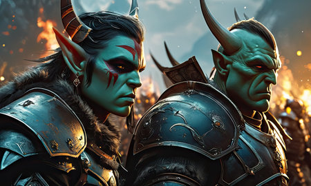 Battle of orcs and paladins, the world of warcraft. A man and an orc face to face, the confrontation of the warriors. Orcs and men in armor