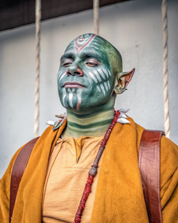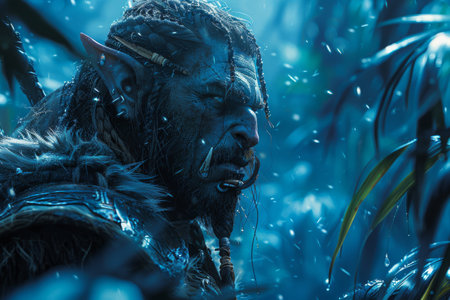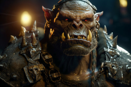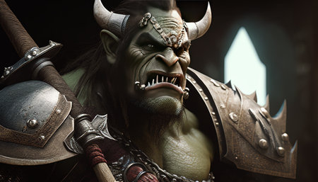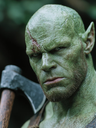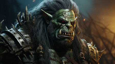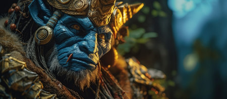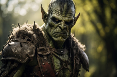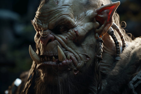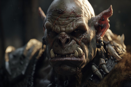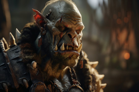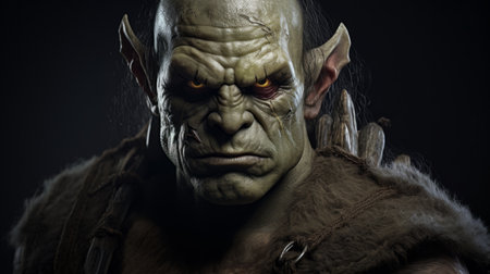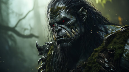 Close-up portrait of a powerful powerful orc warrior in the dark forest