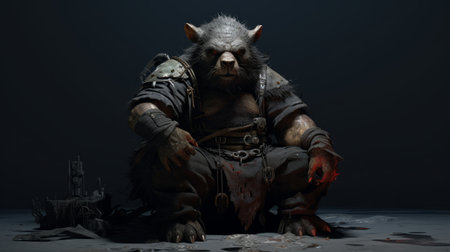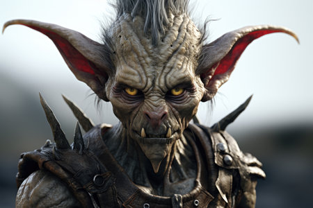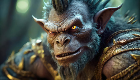 a dark and hungry goblin character, depicted in a realistic animal portrait style, stands with a sword at his side. this artwork showcases intricate layers and textures, created using vray tracing techniques. the matte photo highlights the furry details of the character, while the interactive elements add depth to the overall composition. ai generated