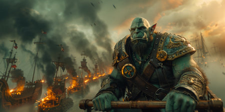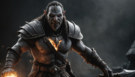 A fierce orc warrior stands ready for battle, his fiery fist clenched and his expression fierce