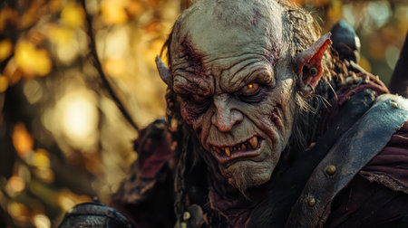 The orc warrior, adorned in tattered armor, gazes intensely from the shadows of the autumn forest, illuminated by golden leaves. He reflects the harshness of past battles.