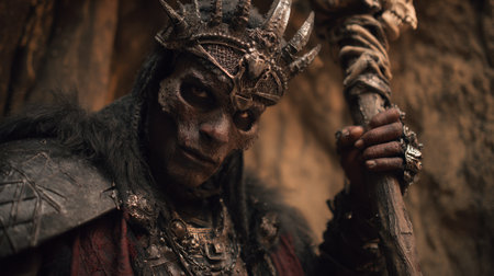 A fierce warrior in a cave wearing tribal jewelry and holding a staff ready for battle.