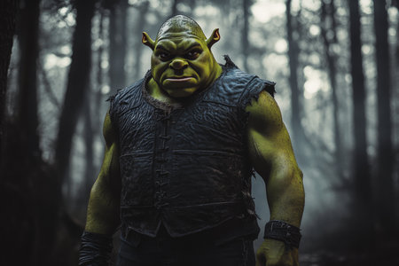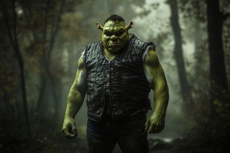 Shrek in a leather vest stands in a dark fantasy forest, captured in cinematic detail and lighting