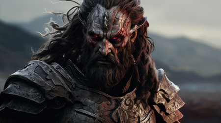 a close-up photo showcasing the intense and expressive character design of the lord of the rings hdrc, created in the style of unreal engine 5. the dark silver and light crimson tones add a captivating touch to the image. shot with a zeiss planar t 80mm f/2.8 lens, this photo captures the meticulous attention to detail by artist aleksi briclot. ai generated
