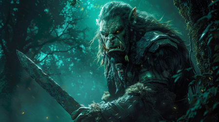 A large green Orc warrior stands in a dark forest, holding a large sword. His face is fierce, and his eyes glow with a menacing light. The forest is thick with trees and vines, and the air is filled with an eerie green mist. The scene is reminiscent of a fantasy novel or film, and evokes a sense of danger and mystery.