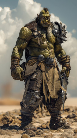 A large, green orc warrior stands in a desert landscape. He is wearing heavy armor and wielding a large ax. The orcs face is fierce and determined, and he appears ready for battle. The background is a cloudy sky.