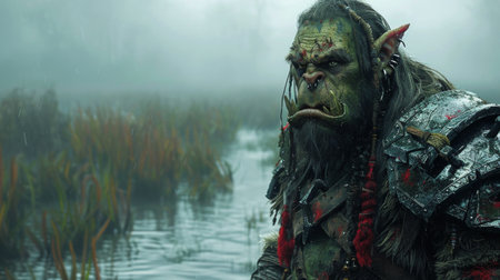 A close-up portrait of a heavily muscled Orc warrior, with large tusks and a determined expression, standing amidst a foggy forest.