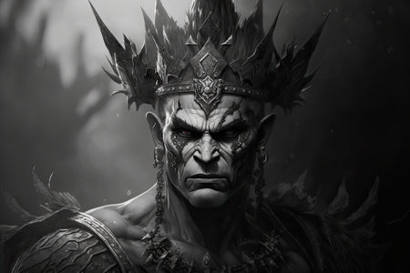 Black and white artwork of a crowned orc