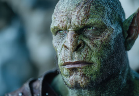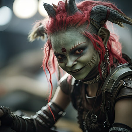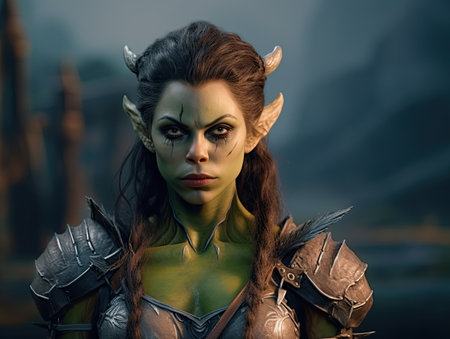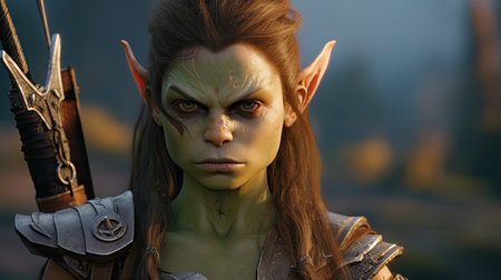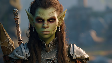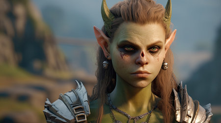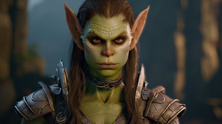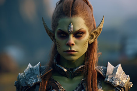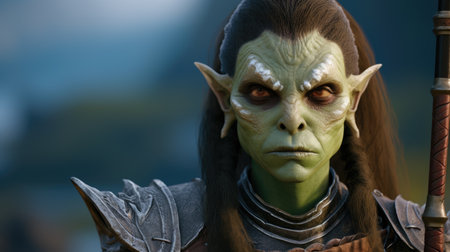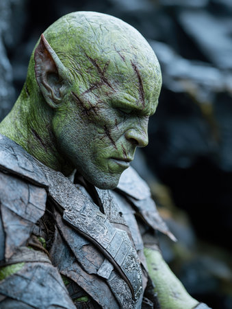 a green-faced character named tork, wearing armor and created in the style of raphael lacoste, is captured in this photo taken with the zeiss milvus 25mm f/1.4 lens. the image showcases realistic and naturalistic textures, reminiscent of the work of igor kieryluk. tork belongs to the world of goblin academia, known for its bold character designs, as seen in this striking portrait by peter coulson.