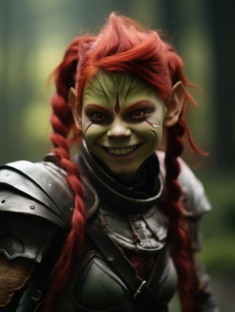 a woman with red hair and green face paint