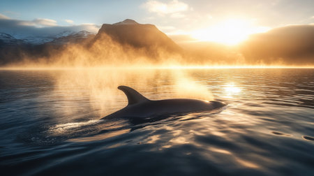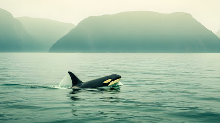 An orca gracefully surfaces in serene waters at sunrise, surrounded by mist and mountains. This breathtaking scene captures the essence of wildlife and nature.