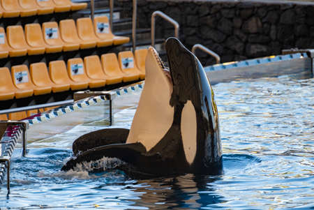 Loro park, Puerto de la Cruz, Tenerife, Canary islands, Spain, December 16, 2021. Trained big black and white orcas whales perform in front of tourists at water show.