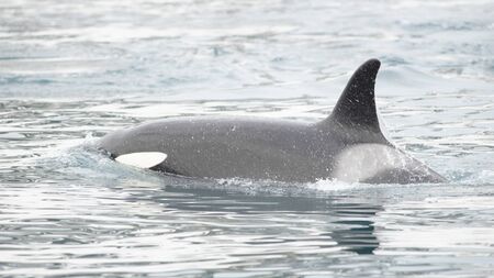 Orca Killer whale near the Iceland mountain coast during winter. Orcinus orca in the water habitat, wildlife scene from nature. Whales in beautiful landscape, snow on the hills.