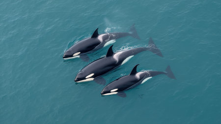 Three majestic orcas swim gracefully in clear turquoise ocean water, showcasing their playful nature and captivating beauty in this stunning aerial view.