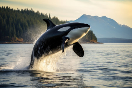 Powerful orca whale leaps from the sea in a graceful breach, symbolizing marine life beauty, strength, and wild nature.