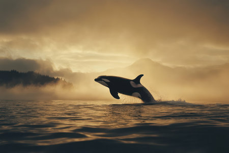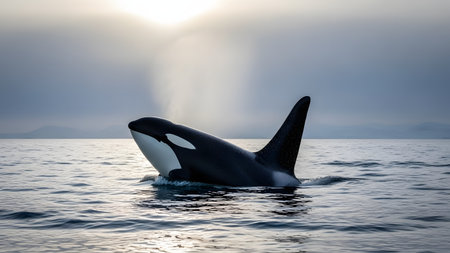 A majestic orca whale breaches the surface of calm, dark waters against a backdrop of misty mountains and soft sunlight. The killer whale's striking black and white pattern is illuminated as it rises gracefully, symbolizing the power of the wild.