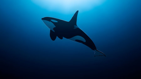 An orca, also known as a killer whale, is depicted swimming underwater. The image features the animal's distinctive black and white coloration, with sunlight streaming through the water. The composition highlights the whale's form against a blue background, suggesting a deep-sea environment. This imagery could be utilized for educational or promotional purposes.