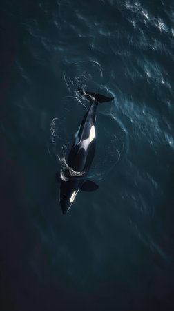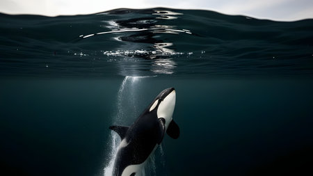 An orca, also known as a killer whale, swims gracefully underwater. The image showcases the animal's striking black and white pattern with the presence of sunlight penetrating the water's surface. It offers potential use in various editorial and commercial contexts, such as educational material or environmental campaigns.